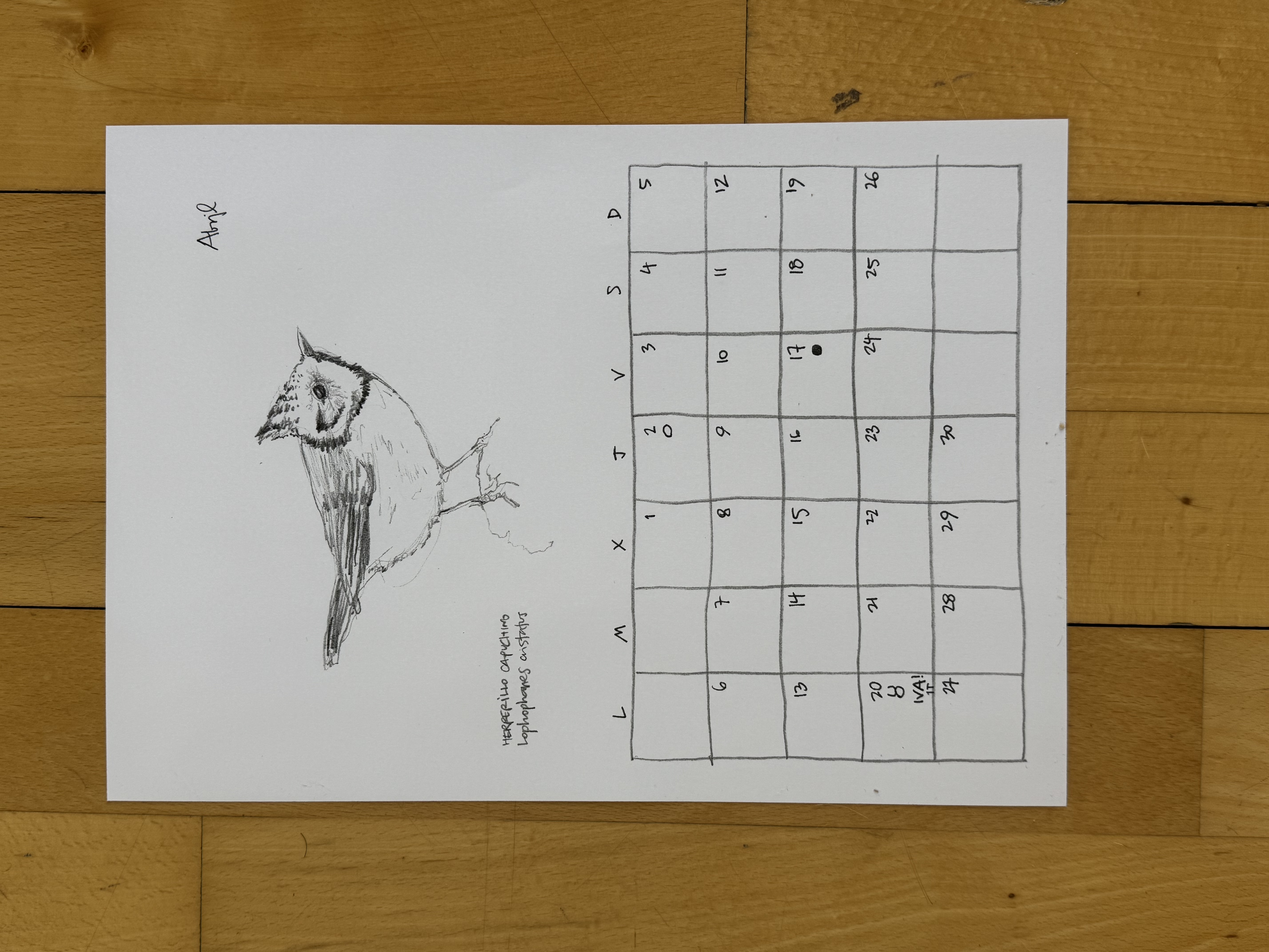 Calendario A4 de 120g dibujado en grafito, escaneado e impreso en negro. Cada ejemplar ha sido intervenido con lápices de colores.