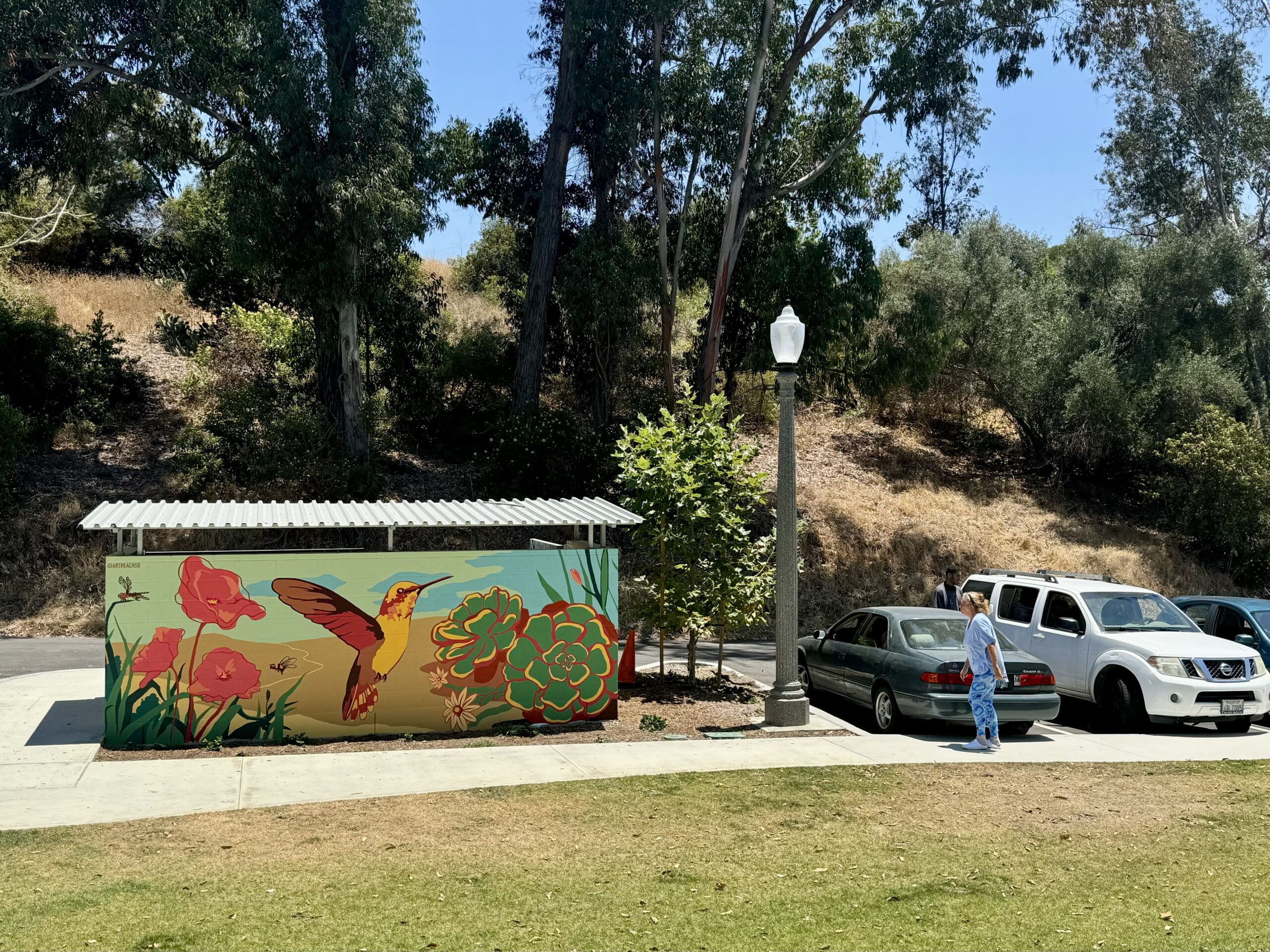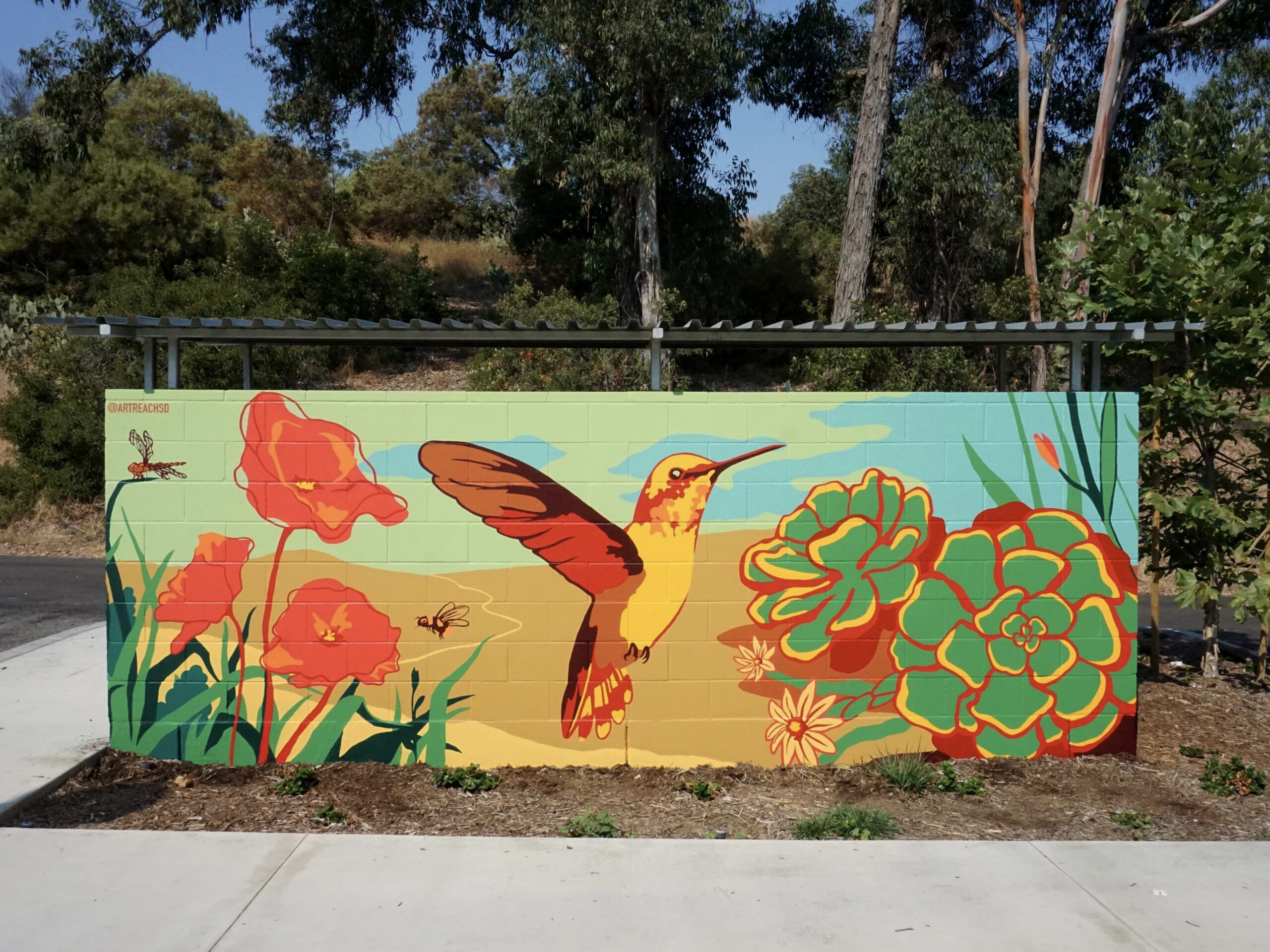 07/2024 Jewel of the Hills in La Mesa, CA. Done with ArtReach San Diego. The mural engaged over 40 participants of all ages in the ideation and painting of this mural, resulting in a serene and vibrant welcome mural for all visitors. I had the pleasure to design it, including local flora and fauna such as California poppies, Allen’s Hummingbird, Mourning Cloak (butterfly), San Diego Alligator Lizard, Bush Sunflowers, and more. It highlights the beautiful hills, paths, and natural environment of this park and surrounding landscape of the City of La Mesa, which is also known as Jewel of the Hills. 9m (2m+5m+2m) x 2m [370’ (80’+210’+80’) x 76’]. More info on this newspiece.